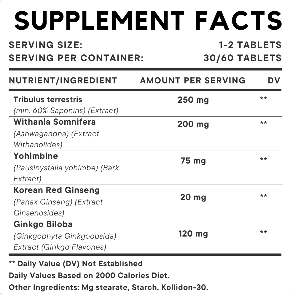 Yohimbine and Tribulus increase blood flow to help with exercise and performance.